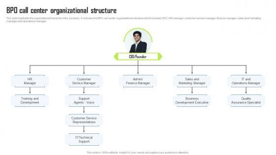 The slide highlights the organizational hierarchy in the company. It includes the BPO call center organizational structure which includes CEO, HR manager, customer service manager, finance manager, sales and marketing manager and operations manager. Slidegeeks is here to make your presentations a breeze with BPO Call Center Organizational Structure IT And Tech Support Business Themes Pdf With our easy-to-use and customizable templates, you can focus on delivering your ideas rather than worrying about formatting. With a variety of designs to choose from, you are sure to find one that suits your needs. And with animations and unique photos, illustrations, and fonts, you can make your presentation pop. So whether you are giving a sales pitch or presenting to the board, make sure to check out Slidegeeks first. The slide highlights the organizational hierarchy in the company. It includes the BPO call center organizational structure which includes CEO, HR manager, customer service manager, finance manager, sales and marketing manager and operations manager.