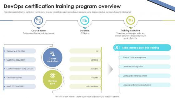 This slide represents DevOps certification training course overview highlighting program elements such as course name, duration, objective, curriculum, tools and skills learned. Present like a pro with DevOps Certification Training Skill Building Plan For Application PPT Presentation DTE SS V. Create beautiful presentations together with your team, using our easy-to-use presentation slides. Share your ideas in real-time and make changes on the fly by downloading our templates. So whether you are in the office, on the go, or in a remote location, you can stay in sync with your team and present your ideas with confidence. With Slidegeeks presentation got a whole lot easier. Grab these presentations today. This slide represents DevOps certification training course overview highlighting program elements such as course name, duration, objective, curriculum, tools and skills learned.