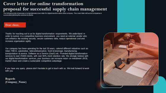The following slide showcases a comprehensive cover letter for digital transformation of the company. This cover letter will assist companies in successfully pitching the services to clients. Take your presentations to the next level with our Cover Letter For Online Transformation Proposal For Successful Supply Chain Management Inspiration Pdf template. With its sleek design and seamless editing features, this single-slide PPT template is a game-changer for professionals who want to make an impact. Impress your audience with stunning visuals and engaging content that will capture their attention from start to finish. Get your hands on our template and elevate your presentations to new heights. The following slide showcases a comprehensive cover letter for digital transformation of the company. This cover letter will assist companies in successfully pitching the services to clients.
