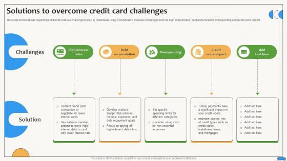 This slide shows details regarding solutions to various challenges faced by individuals using a credit card It includes challenges such as high interest rates, debt accumulation, overspending and credit score impact. Get a simple yet stunning designed Solutions To Overcome Credit Card Challenges Swipe Smartly A Practical Guide Fin SS V. It is the best one to establish the tone in your meetings. It is an excellent way to make your presentations highly effective. So, download this PPT today from Slidegeeks and see the positive impacts. Our easy-to-edit Solutions To Overcome Credit Card Challenges Swipe Smartly A Practical Guide Fin SS V can be your go-to option for all upcoming conferences and meetings. So, what are you waiting for Grab this template today. This slide shows details regarding solutions to various challenges faced by individuals using a credit card It includes challenges such as high interest rates, debt accumulation, overspending and credit score impact.