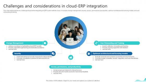 This slide addresses the key challenges faced while Integrating an ERP system with the cloud. It includes change management, security, access, permissions and productivity, optimum architectural and licensing models, and user onboarding and training.Slidegeeks is here to make your presentations a breeze with Challenges And Considerations In Cloud Erp Integration Erp And Digital Transformation For Maximizing DT SS V With our easy-to-use and customizable templates, you can focus on delivering your ideas rather than worrying about formatting. With a variety of designs to choose from, you are sure to find one that suits your needs. And with animations and unique photos, illustrations, and fonts, you can make your presentation pop. So whether you are giving a sales pitch or presenting to the board, make sure to check out Slidegeeks first This slide addresses the key challenges faced while Integrating an ERP system with the cloud. It includes change management, security, access, permissions and productivity, optimum architectural and licensing models, and user onboarding and training.
