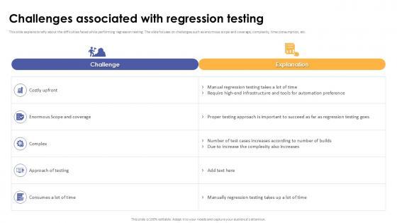 This slide explains briefly about the difficulties faced while performing regression testing. The slide focuses on challenges such as enormous scope and coverage, complexity, time consumption, etc. Slidegeeks is here to make your presentations a breeze with Challenges Associated With Regression Testing Corrective Regression Testing Ppt Template With our easy-to-use and customizable templates, you can focus on delivering your ideas rather than worrying about formatting. With a variety of designs to choose from, you are sure to find one that suits your needs. And with animations and unique photos, illustrations, and fonts, you can make your presentation pop. So whether you are giving a sales pitch or presenting to the board, make sure to check out Slidegeeks first This slide explains briefly about the difficulties faced while performing regression testing. The slide focuses on challenges such as enormous scope and coverage, complexity, time consumption, etc.
