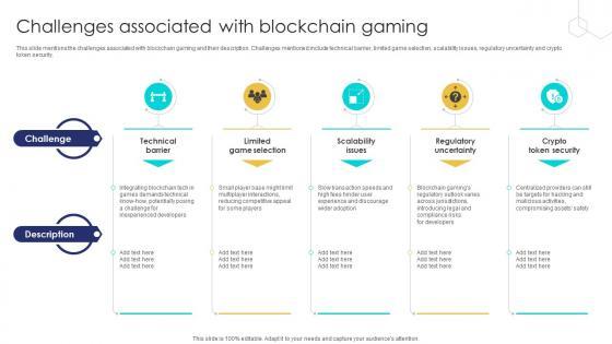 This slide mentions the challenges associated with blockchain gaming and their description. Challenges mentioned include technical barrier, limited game selection, scalability issues, regulatory uncertainty and crypto token security. Crafting an eye-catching presentation has never been more straightforward. Let your presentation shine with this tasteful yet straightforward Unlocking The Potential Of Challenges Associated With Blockchain Gaming BCT SS V template. It offers a minimalistic and classy look that is great for making a statement. The colors have been employed intelligently to add a bit of playfulness while still remaining professional. Construct the ideal Unlocking The Potential Of Challenges Associated With Blockchain Gaming BCT SS V that effortlessly grabs the attention of your audience Begin now and be certain to wow your customers This slide mentions the challenges associated with blockchain gaming and their description. Challenges mentioned include technical barrier, limited game selection, scalability issues, regulatory uncertainty and crypto token security.