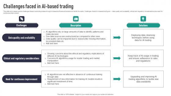 This slide showcases various challenges faced in executing trades through AI-based software and solutions to tackle the same. Challenges faced in AI-based tracing are data quality and availability, ethical and regulatory considerations plus need for continuous improvement.Find a pre-designed and impeccable Challenges Faced In Ai Based Trading Artificial Intelligence Applications Demonstration Pdf. The templates can ace your presentation without additional effort. You can download these easy-to-edit presentation templates to make your presentation stand out from others. So, what are you waiting for Download the template from Slidegeeks today and give a unique touch to your presentation. This slide showcases various challenges faced in executing trades through AI based software and solutions to tackle the same. Challenges faced in AI based tracing are data quality and availability, ethical and regulatory considerations plus need for continuous improvement.