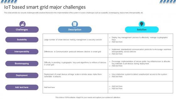 This slide exhibits key security challenges with solutions that exist in the implementation of the system. It covers challenges such as scalability, bootstrapping, deployment, interoperability, etc. Take your projects to the next level with our ultimate collection of Empowering The Future IoT Based Smart Grid Major Challenges IoT SS V. Slidegeeks has designed a range of layouts that are perfect for representing task or activity duration, keeping track of all your deadlines at a glance. Tailor these designs to your exact needs and give them a truly corporate look with your own brand colors they will make your projects stand out from the rest This slide exhibits key security challenges with solutions that exist in the implementation of the system. It covers challenges such as scalability, bootstrapping, deployment, interoperability, etc.