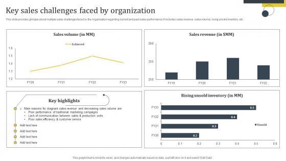 This slide provides glimpse about multiple sales challenges faced by the organization regarding current and past sales performance. It includes sales revenue, sales volume, rising unsold inventory, etc. This Enhance Customer Retention Key Sales Challenges Faced By Organization Diagrams Pdf is perfect for any presentation, be it in front of clients or colleagues. It is a versatile and stylish solution for organizing your meetings. The Enhance Customer Retention Key Sales Challenges Faced By Organization Diagrams Pdf features a modern design for your presentation meetings. The adjustable and customizable slides provide unlimited possibilities for acing up your presentation. Slidegeeks has done all the homework before launching the product for you. So, do not wait, grab the presentation templates today This slide provides glimpse about multiple sales challenges faced by the organization regarding current and past sales performance. It includes sales revenue, sales volume, rising unsold inventory, etc.