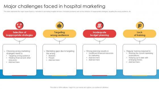 This slide represents the major issues faced by marketers in promoting hospital services. It includes problems such as the selection of inappropriate strategies, targeting the wrong audience, etc. Boost your pitch with our creative Major Challenges Faced In Hospital Marketing Implementation Of Online Ppt Slides. Deliver an awe-inspiring pitch that will mesmerize everyone. Using these presentation templates you will surely catch everyones attention. You can browse the ppts collection on our website. We have researchers who are experts at creating the right content for the templates. So you do not have to invest time in any additional work. Just grab the template now and use them. This slide represents the major issues faced by marketers in promoting hospital services. It includes problems such as the selection of inappropriate strategies, targeting the wrong audience, etc.