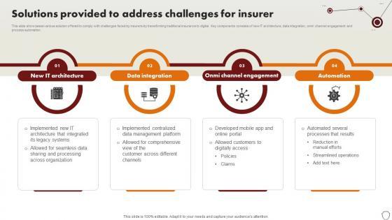 This slide showcases various solution offered to comply with challenges faced by insurers by transforming traditional insurance to digital. Key components consists of new IT architecture, data integration, omni channel engagement and process automation. If you are looking for a format to display your unique thoughts, then the professionally designed Technology Trends In Online Insurance Solutions Provided To Address Challenges For Insurer is the one for you. You can use it as a Google Slides template or a PowerPoint template. Incorporate impressive visuals, symbols, images, and other charts. Modify or reorganize the text boxes as you desire. Experiment with shade schemes and font pairings. Alter, share or cooperate with other people on your work. Download Technology Trends In Online Insurance Solutions Provided To Address Challenges For Insurer and find out how to give a successful presentation. Present a perfect display to your team and make your presentation unforgettable. This slide showcases various solution offered to comply with challenges faced by insurers by transforming traditional insurance to digital. Key components consists of new IT architecture, data integration, omni channel engagement and process automation.