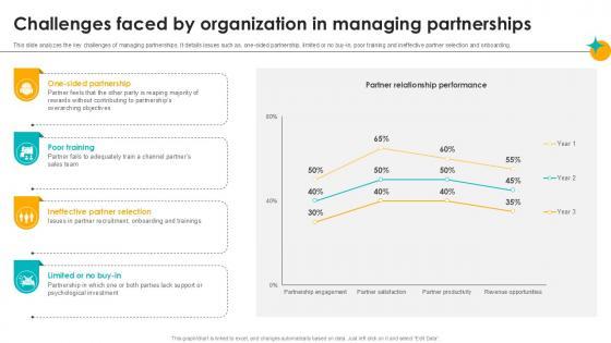This slide analyzes the key challenges of managing partnerships. It details issues such as, one-sided partnership, limited or no buy-in, poor training and ineffective partner selection and onboarding. Whether you have daily or monthly meetings, a brilliant presentation is necessary. Challenges Faced By Organization In Managing Partner Relationship Ppt Template can be your best option for delivering a presentation. Represent everything in detail using Challenges Faced By Organization In Managing Partner Relationship Ppt Template and make yourself stand out in meetings. The template is versatile and follows a structure that will cater to your requirements. All the templates prepared by Slidegeeks are easy to download and edit. Our research experts have taken care of the corporate themes as well. So, give it a try and see the results. This slide analyzes the key challenges of managing partnerships. It details issues such as, one sided partnership, limited or no buy in, poor training and ineffective partner selection and onboarding.