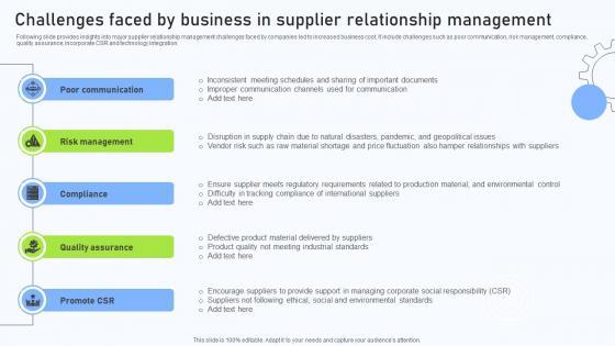 Following slide provides insights into major supplier relationship management challenges faced by companies led to increased business cost. It include challenges such as poor communication, risk management, compliance, quality assurance, incorporate CSR and technology integration. Slidegeeks is here to make your presentations a breeze with Challenges Faced By Business In Supplier Relationship Management Portrait PDF With our easy-to-use and customizable templates, you can focus on delivering your ideas rather than worrying about formatting. With a variety of designs to choose from, you are sure to find one that suits your needs. And with animations and unique photos, illustrations, and fonts, you can make your presentation pop. So whether you are giving a sales pitch or presenting to the board, make sure to check out Slidegeeks first