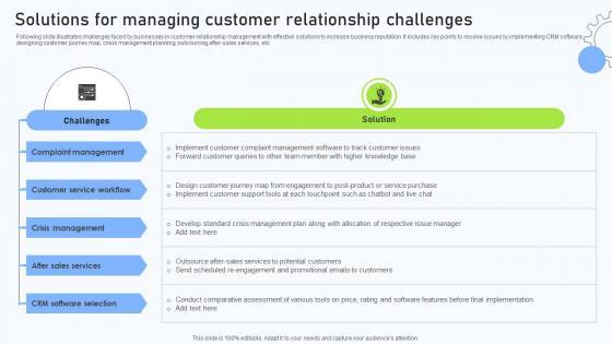 Following slide illustrates challenges faced by businesses in customer relationship management with effective solutions to increase business reputation. It includes key points to resolve issues by implementing CRM software, designing customer journey map, crisis management planning, outsourcing after-sales services, etc. Do you have to make sure that everyone on your team knows about any specific topic I yes, then you should give Relationship Management Automation Solutions For Managing Customer Relationship Challenges a try. Our experts have put a lot of knowledge and effort into creating this impeccable Relationship Management Automation Solutions For Managing Customer Relationship Challenges. You can use this template for your upcoming presentations, as the slides are perfect to represent even the tiniest detail. You can download these templates from the Slidegeeks website and these are easy to edit. So grab these today Following slide illustrates challenges faced by businesses in customer relationship management with effective solutions to increase business reputation. It includes key points to resolve issues by implementing CRM software, designing customer journey map, crisis management planning, outsourcing after-sales services, etc.