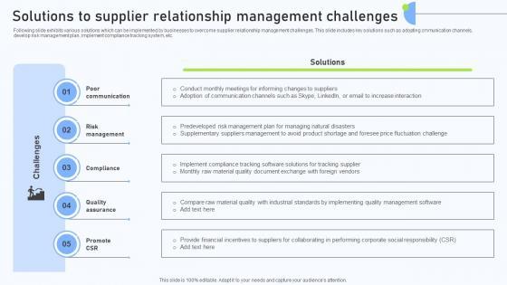 Following slide exhibits various solutions which can be implemented by businesses to overcome supplier relationship management challenges. This slide includes key solutions such as adopting cmmunication channels, develop risk management plan, implement compliance tracking system, etc. Get a simple yet stunning designed Relationship Management Automation Solutions To Supplier Relationship Management Challenges. It is the best one to establish the tone in your meetings. It is an excellent way to make your presentations highly effective. So, download this PPT today from Slidegeeks and see the positive impacts. Our easy-to-edit Relationship Management Automation Solutions To Supplier Relationship Management Challenges can be your go-to option for all upcoming conferences and meetings. So, what are you waiting for Grab this template today. Following slide exhibits various solutions which can be implemented by businesses to overcome supplier relationship management challenges. This slide includes key solutions such as adopting cmmunication channels, develop risk management plan, implement compliance tracking system, etc.