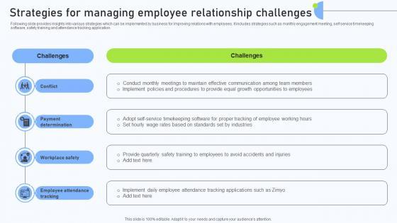 Following slide provides insights into various strategies which can be implemented by business for improving relations with employees. It includes strategies such as monthly engagement meeting, self service timekeeping software, safety training and attendance tracking application. Find highly impressive Strategies For Managing Employee Relationship Challenges Themes PDF on Slidegeeks to deliver a meaningful presentation. You can save an ample amount of time using these presentation templates. No need to worry to prepare everything from scratch because Slidegeeks experts have already done a huge research and work for you. You need to download Strategies For Managing Employee Relationship Challenges Themes PDF for your upcoming presentation. All the presentation templates are 100 percent editable and you can change the color and personalize the content accordingly. Download now