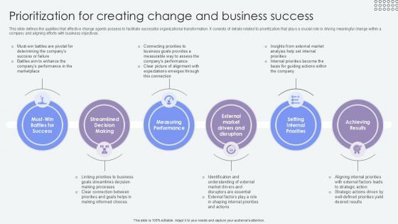 This slide defines the qualities that effective change agents possess to facilitate successful organizational transformation. It consists of details related to prioritization that plays a crucial role in driving meaningful change within a company and aligning efforts with business objectives. This Prioritization For Creating Change Agents Of Change Pioneers PPT Example CM SS V from Slidegeeks makes it easy to present information on your topic with precision. It provides customization options, so you can make changes to the colors, design, graphics, or any other component to create a unique layout. It is also available for immediate download, so you can begin using it right away. Slidegeeks has done good research to ensure that you have everything you need to make your presentation stand out. Make a name out there for a brilliant performance. This slide defines the qualities that effective change agents possess to facilitate successful organizational transformation. It consists of details related to prioritization that plays a crucial role in driving meaningful change within a company and aligning efforts with business objectives.