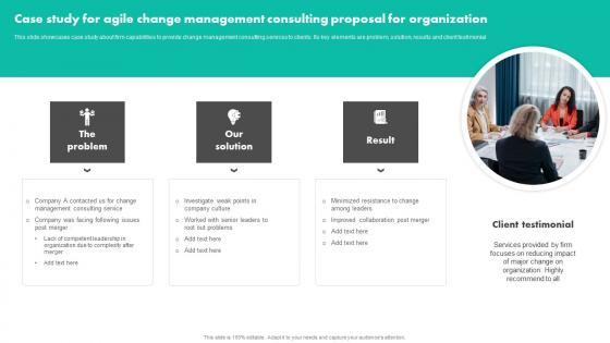This slide showcases case study about firm capabilities to provide change management consulting services to clients. Its key elements are problem, solution, results and client testimonial. Unleash your creativity with our Case Study For Agile Change Management Consulting Proposal For Organization Brochure PDF single-slide PPT template. Whether you are a seasoned presenter or a newbie, our editable and visually-stunning template will make your presentations shine. This template is versatile and easy to use. Make your presentations unforgettable with our premium template and leave a lasting impression on your audience. This slide showcases case study about firm capabilities to provide change management consulting services to clients. Its key elements are problem, solution, results and client testimonial