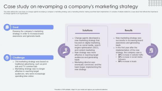 This slide defines the case study on change agents revamping a companys marketing strategy and a marketing director making sure their team implements it. It consists of details related to a case study that reflects the importance of change agents in an organization. Get a simple yet stunning designed Case Study On Revamping A Companys Agents Of Change Pioneers PPT Sample CM SS V. It is the best one to establish the tone in your meetings. It is an excellent way to make your presentations highly effective. So, download this PPT today from Slidegeeks and see the positive impacts. Our easy-to-edit Case Study On Revamping A Companys Agents Of Change Pioneers PPT Sample CM SS V can be your go-to option for all upcoming conferences and meetings. So, what are you waiting for Grab this template today. This slide defines the case study on change agents revamping a companys marketing strategy and a marketing director making sure their team implements it. It consists of details related to a case study that reflects the importance of change agents in an organization.