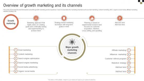 This slide showcases the brief introduction about the growth marketing and its objectives. It also incorporates the marketing channels such as email marketing, content marketing, SEO, organic social media, affiliate marketing, retention strategy, etc. Crafting an eye-catching presentation has never been more straightforward. Let your presentation shine with this tasteful yet straightforward A Comprehensive Approach To Overview Of Growth Marketing And Its Channels MKT SS V template. It offers a minimalistic and classy look that is great for making a statement. The colors have been employed intelligently to add a bit of playfulness while still remaining professional. Construct the ideal A Comprehensive Approach To Overview Of Growth Marketing And Its Channels MKT SS V that effortlessly grabs the attention of your audience Begin now and be certain to wow your customers This slide showcases the brief introduction about the growth marketing and its objectives. It also incorporates the marketing channels such as email marketing, content marketing, SEO, organic social media, affiliate marketing, retention strategy, etc.