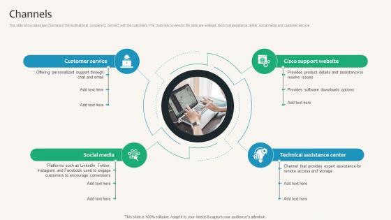This slide showcases key channels of the multinational company to connect with the customers. The channels covered in the slide are website, technical assistance center, social media and customer service. Boost your pitch with our creative Channels Cloud Networking Service Provider Business Model BMC SS V. Deliver an awe-inspiring pitch that will mesmerize everyone. Using these presentation templates you will surely catch everyones attention. You can browse the ppts collection on our website. We have researchers who are experts at creating the right content for the templates. So you do not have to invest time in any additional work. Just grab the template now and use them. This slide showcases key channels of the multinational company to connect with the customers. The channels covered in the slide are website, technical assistance center, social media and customer service.