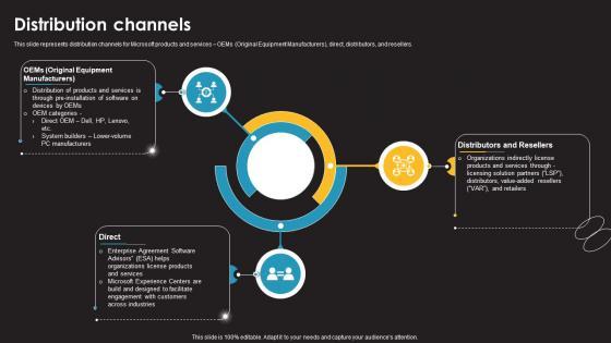 This slide represents distribution channels for Microsoft products and services OEMs Original Equipment Manufacturers, direct, distributors, and resellers.Get a simple yet stunning designed Distribution Channels Information Technology Services Provider Company Profile CP SS V. It is the best one to establish the tone in your meetings. It is an excellent way to make your presentations highly effective. So, download this PPT today from Slidegeeks and see the positive impacts. Our easy-to-edit Distribution Channels Information Technology Services Provider Company Profile CP SS V can be your go-to option for all upcoming conferences and meetings. So, what are you waiting for Grab this template today. This slide represents distribution channels for Microsoft products and services OEMs Original Equipment Manufacturers, direct, distributors, and resellers.