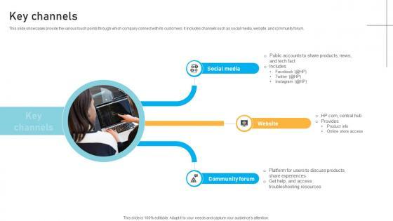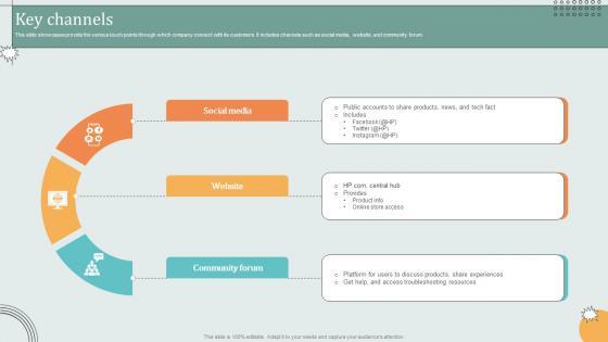 This slide showcases provide the various touch points through which company connect with its customers. It includes channels such as social media, website, and community forum. From laying roadmaps to briefing everything in detail, our templates are perfect for you. You can set the stage with your presentation slides. All you have to do is download these easy-to-edit and customizable templates. Key Channels Hardware Technology Provider Business Model BMC SS V will help you deliver an outstanding performance that everyone would remember and praise you for. Do download this presentation today. This slide showcases provide the various touch points through which company connect with its customers. It includes channels such as social media, website, and community forum.