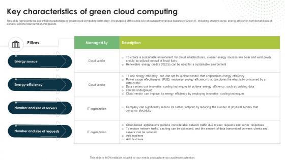 This slide represents the essential characteristics of green cloud computing technology. The purpose of this slide is to showcase the various features of Green IT, including energy source, energy efficiency, number and size of servers, and the total number of requests.Presenting this PowerPoint presentation, titled Key Characteristics Of Green Cloud Computing Eco Friendly Computing IT, with topics curated by our researchers after extensive research. This editable presentation is available for immediate download and provides attractive features when used. Download now and captivate your audience. Presenting this Key Characteristics Of Green Cloud Computing Eco Friendly Computing IT. Our researchers have carefully researched and created these slides with all aspects taken into consideration. This is a completely customizable Key Characteristics Of Green Cloud Computing Eco Friendly Computing IT that is available for immediate downloading. Download now and make an impact on your audience. Highlight the attractive features available with our PPTs. This slide represents the essential characteristics of green cloud computing technology. The purpose of this slide is to showcase the various features of Green IT, including energy source, energy efficiency, number and size of servers, and the total number of requests.