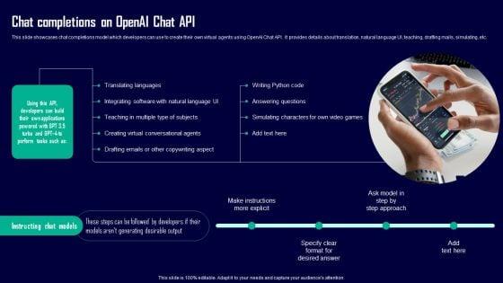 This slide showcases chat completions model which developers can use to create their own virtual agents using OpenAI Chat API. It provides details about translation, natural language UI, teaching, drafting mails, simulating, etc. Want to ace your presentation in front of a live audience Our Leveraging Openai API For Business Chat Completions On Openai Chat API Demonstration PDF can help you do that by engaging all the users towards you. Slidegeeks experts have put their efforts and expertise into creating these impeccable powerpoint presentations so that you can communicate your ideas clearly. Moreover, all the templates are customizable, and easy to edit and downloadable. Use these for both personal and commercial use.