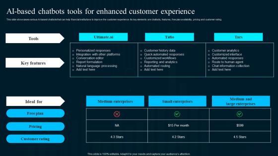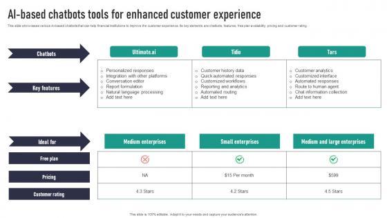 This slide showcases various AI-based chatbots that can help financial institutions to improve the customer experience. Its key elements are chatbots, features, free plan availability, pricing and customer rating.Create an editable Ai Based Chatbots Tools For Enhanced Artificial Intelligence Applications Mockup Pdf that communicates your idea and engages your audience. Whether you are presenting a business or an educational presentation, pre-designed presentation templates help save time. Ai Based Chatbots Tools For Enhanced Artificial Intelligence Applications Mockup Pdf is highly customizable and very easy to edit, covering many different styles from creative to business presentations. Slidegeeks has creative team members who have crafted amazing templates. So, go and get them without any delay. This slide showcases various AI based chatbots that can help financial institutions to improve the customer experience. Its key elements are chatbots, features, free plan availability, pricing and customer rating.