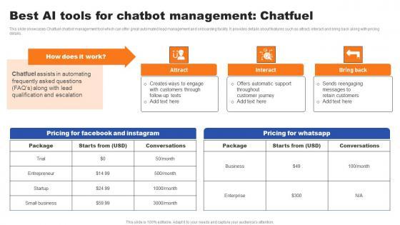 This slide showcases Chatfuel chatbot management tool which can offer great automated lead management and onboarding facility. It provides details about features such as attract, interact and bring back along with pricing details. If you are looking for a format to display your unique thoughts, then the professionally designed Best AI Tools For Chatbot Management Chatfuel Ppt Show Objects PDF is the one for you. You can use it as a Google Slides template or a PowerPoint template. Incorporate impressive visuals, symbols, images, and other charts. Modify or reorganize the text boxes as you desire. Experiment with shade schemes and font pairings. Alter, share or cooperate with other people on your work. Download Best AI Tools For Chatbot Management Chatfuel Ppt Show Objects PDF and find out how to give a successful presentation. Present a perfect display to your team and make your presentation unforgettable. This slide showcases Chatfuel chatbot management tool which can offer great automated lead management and onboarding facility. It provides details about features such as attract, interact and bring back along with pricing details.