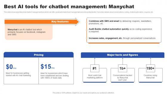 This slide showcases Manychat chatbot management tool which can offer great automated lead management and onboarding facility. It provides details about conversations, coding, chatbot automation, coupons, etc. Are you in need of a template that can accommodate all of your creative concepts This one is crafted professionally and can be altered to fit any style. Use it with Google Slides or PowerPoint. Include striking photographs, symbols, depictions, and other visuals. Fill, move around, or remove text boxes as desired. Test out color palettes and font mixtures. Edit and save your work, or work with colleagues. Download Best AI Tools For Chatbot Management Manychat Ppt Styles Infographics PDF and observe how to make your presentation outstanding. Give an impeccable presentation to your group and make your presentation unforgettable. This slide showcases Manychat chatbot management tool which can offer great automated lead management and onboarding facility. It provides details about conversations, coding, chatbot automation, coupons, etc.