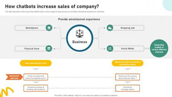 This slide represents various ways that chatbots help in various stages of sales process by providing omnichannel experience to customers. Find highly impressive How Chatbots Increase Sales Sample Pitch Deck For Video Ppt Slide on Slidegeeks to deliver a meaningful presentation. You can save an ample amount of time using these presentation templates. No need to worry to prepare everything from scratch because Slidegeeks experts have already done a huge research and work for you. You need to download How Chatbots Increase Sales Sample Pitch Deck For Video Ppt Slide for your upcoming presentation. All the presentation templates are 100 percent editable and you can change the color and personalize the content accordingly. Download now This slide represents various ways that chatbots help in various stages of sales process by providing omnichannel experience to customers.