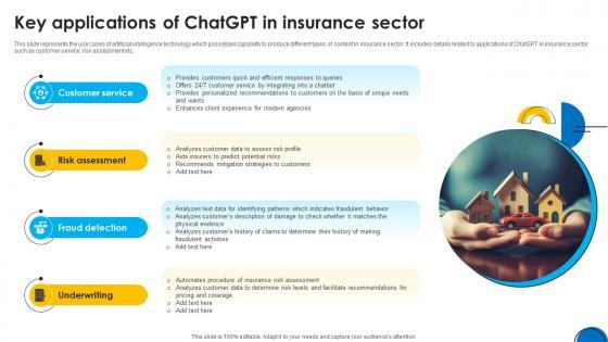 This slide represents the use cases of artificial intelligence technology which possesses capability to produce different types of content in insurance sector. It includes details related to applications of ChatGPT in insurance sector such as customer service, risk assessment etc. Make sure to capture your audiences attention in your business displays with our gratis customizable Implementing ChatGpt In Insurance Key Applications Of ChatGpt In Insurance ChatGpt SS V. These are great for business strategies, office conferences, capital raising or task suggestions. If you desire to acquire more customers for your tech business and ensure they stay satisfied, create your own sales presentation with these plain slides. This slide represents the use cases of artificial intelligence technology which possesses capability to produce different types of content in insurance sector. It includes details related to applications of ChatGPT in insurance sector such as customer service, risk assessment etc.