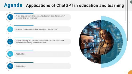 Boost your pitch with our creative Agenda Applications Of ChatGPT In Education And Learning ChatGPT SS V. Deliver an awe-inspiring pitch that will mesmerize everyone. Using these presentation templates you will surely catch everyones attention. You can browse the ppts collection on our website. We have researchers who are experts at creating the right content for the templates. So you do not have to invest time in any additional work. Just grab the template now and use them. Our Agenda Applications Of ChatGPT In Education And Learning ChatGPT SS V are topically designed to provide an attractive backdrop to any subject. Use them to look like a presentation pro.