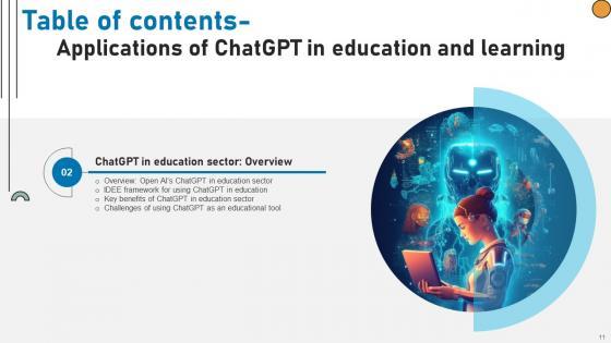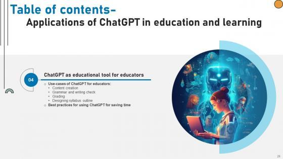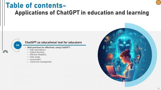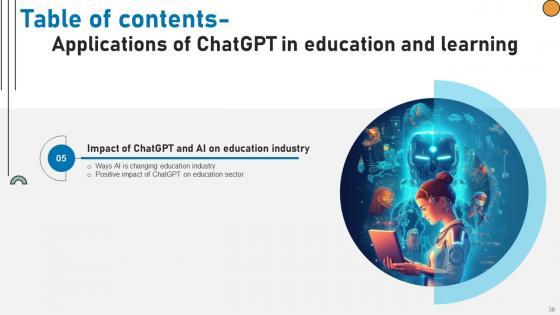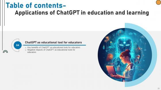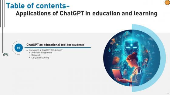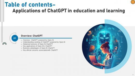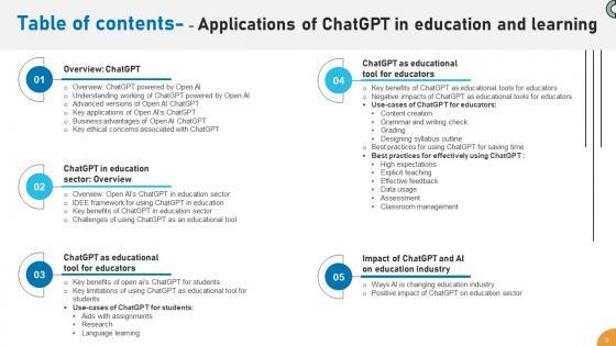 Here you can discover an assortment of the finest PowerPoint and Google Slides templates. With these templates, you can create presentations for a variety of purposes while simultaneously providing your audience with an eye-catching visual experience. Download Table Of Contents For Applications Of ChatGPT In Education And Learning ChatGPT SS V to deliver an impeccable presentation. These templates will make your job of preparing presentations much quicker, yet still, maintain a high level of quality. Slidegeeks has experienced researchers who prepare these templates and write high-quality content for you. Later on, you can personalize the content by editing the Table Of Contents For Applications Of ChatGPT In Education And Learning ChatGPT SS V. Our Table Of Contents For Applications Of ChatGPT In Education And Learning ChatGPT SS V are topically designed to provide an attractive backdrop to any subject. Use them to look like a presentation pro.