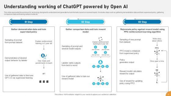 This slide represents the working of AI technology designed to understand and generate human-like texts based on received inputs. It includes steps such as gathering demonstration data and train supervised policy, gathering comparison data and training reward model etc. This Understanding Working Of ChatGPT Powered Applications Of ChatGPT In Education ChatGPT SS V from Slidegeeks makes it easy to present information on your topic with precision. It provides customization options, so you can make changes to the colors, design, graphics, or any other component to create a unique layout. It is also available for immediate download, so you can begin using it right away. Slidegeeks has done good research to ensure that you have everything you need to make your presentation stand out. Make a name out there for a brilliant performance. This slide represents the working of AI technology designed to understand and generate human-like texts based on received inputs. It includes steps such as gathering demonstration data and train supervised policy, gathering comparison data and training reward model etc.