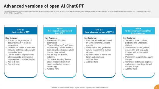 This slide represents details related to versions of AI technology developed by Open AI which uses deep learning algorithms for generating human like text. It includes details related to versions of GPT chatbot such as GPT-2, GPT-3, GPT-3.5 and GPT-4. Find a pre-designed and impeccable Advanced Versions Of Open AI ChatGPT Applications Of ChatGPT In Education ChatGPT SS V. The templates can ace your presentation without additional effort. You can download these easy-to-edit presentation templates to make your presentation stand out from others. So, what are you waiting for Download the template from Slidegeeks today and give a unique touch to your presentation. This slide represents details related to versions of AI technology developed by Open AI which uses deep learning algorithms for generating human like text. It includes details related to versions of GPT chatbot such as GPT-2, GPT-3, GPT-3.5 and GPT-4.