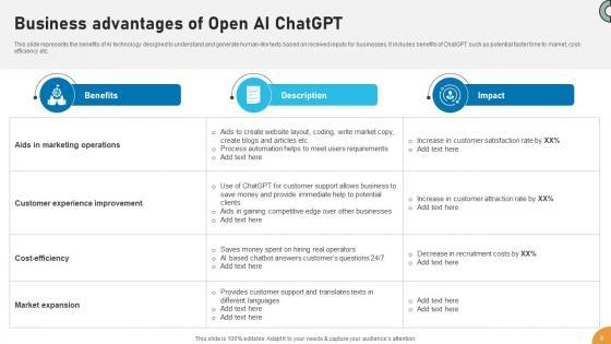 This slide represents the benefits of AI technology designed to understand and generate human-like texts based on received inputs for businesses. It includes benefits of ChatGPT such as potential faster time to market, cost-efficiency etc. Slidegeeks is one of the best resources for PowerPoint templates. You can download easily and regulate Business Advantages Of Open AI ChatGPT Applications Of ChatGPT In Education ChatGPT SS V for your personal presentations from our wonderful collection. A few clicks is all it takes to discover and get the most relevant and appropriate templates. Use our Templates to add a unique zing and appeal to your presentation and meetings. All the slides are easy to edit and you can use them even for advertisement purposes. This slide represents the benefits of AI technology designed to understand and generate human-like texts based on received inputs for businesses. It includes benefits of ChatGPT such as potential faster time to market, cost-efficiency etc.