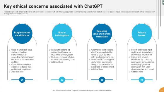 This slide represents details related to key ethical concerns associated with AI technology designed to understand and generate human-like texts based on received inputs. It includes details related to ethical concerns such as plagiarism and deceitful use etc. Explore a selection of the finest Key Ethical Concerns Associated With ChatGPT Applications Of ChatGPT In Education ChatGPT SS V here. With a plethora of professionally designed and pre-made slide templates, you can quickly and easily find the right one for your upcoming presentation. You can use our Key Ethical Concerns Associated With ChatGPT Applications Of ChatGPT In Education ChatGPT SS V to effectively convey your message to a wider audience. Slidegeeks has done a lot of research before preparing these presentation templates. The content can be personalized and the slides are highly editable. Grab templates today from Slidegeeks. This slide represents details related to key ethical concerns associated with AI technology designed to understand and generate human-like texts based on received inputs. It includes details related to ethical concerns such as plagiarism and deceitful use etc.