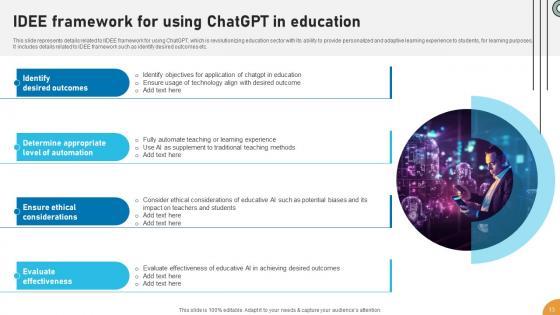 This slide represents details related to IIDEE framework for using ChatGPT, which is revolutionizing education sector with its ability to provide personalized and adaptive learning experience to students, for learning purposes. It includes details related to IDEE framework such as identify desired outcomes etc. Formulating a presentation can take up a lot of effort and time, so the content and message should always be the primary focus. The visuals of the PowerPoint can enhance the presenters message, so our IDEE Framework For Using ChatGPT In Applications Of ChatGPT In Education ChatGPT SS V was created to help save time. Instead of worrying about the design, the presenter can concentrate on the message while our designers work on creating the ideal templates for whatever situation is needed. Slidegeeks has experts for everything from amazing designs to valuable content, we have put everything into IDEE Framework For Using ChatGPT In Applications Of ChatGPT In Education ChatGPT SS V This slide represents details related to IIDEE framework for using ChatGPT, which is revolutionizing education sector with its ability to provide personalized and adaptive learning experience to students, for learning purposes. It includes details related to IDEE framework such as identify desired outcomes etc.