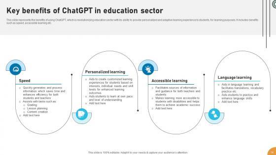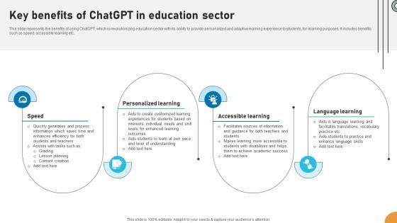This slide represents the benefits of using ChatGPT, which is revolutionizing education sector with its ability to provide personalized and adaptive learning experience to students, for learning purposes. It includes benefits such as speed, accessible learning etc.This Key Benefits Of ChatGPT In Education Sector Applications Of ChatGPT In Education ChatGPT SS V is perfect for any presentation, be it in front of clients or colleagues. It is a versatile and stylish solution for organizing your meetings. The Key Benefits Of ChatGPT In Education Sector Applications Of ChatGPT In Education ChatGPT SS V features a modern design for your presentation meetings. The adjustable and customizable slides provide unlimited possibilities for acing up your presentation. Slidegeeks has done all the homework before launching the product for you. So, do not wait, grab the presentation templates today This slide represents the benefits of using ChatGPT, which is revolutionizing education sector with its ability to provide personalized and adaptive learning experience to students, for learning purposes. It includes benefits such as speed, accessible learning etc.
