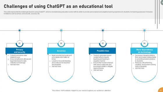 This slide represents the challenges faced in using ChatGPT, which is revolutionizing education sector with its ability to provide personalized and adaptive learning experience to students, for learning purposes. It includes limitations such as privacy and security, accuracy etc. Want to ace your presentation in front of a live audience Our Challenges Of Using ChatGPT As An Applications Of ChatGPT In Education ChatGPT SS V can help you do that by engaging all the users towards you. Slidegeeks experts have put their efforts and expertise into creating these impeccable powerpoint presentations so that you can communicate your ideas clearly. Moreover, all the templates are customizable, and easy-to-edit and downloadable. Use these for both personal and commercial use. This slide represents the challenges faced in using ChatGPT, which is revolutionizing education sector with its ability to provide personalized and adaptive learning experience to students, for learning purposes. It includes limitations such as privacy and security, accuracy etc.