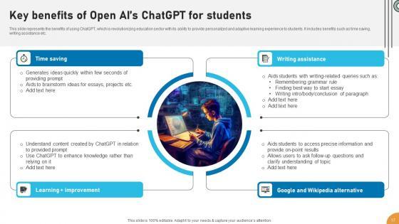 This slide represents the benefits of using ChatGPT, which is revolutionizing education sector with its ability to provide personalized and adaptive learning experience to students. It includes benefits such as time saving, writing assistance etc. Welcome to our selection of the Key Benefits Of Open AIs ChatGPT For Students Applications Of ChatGPT In Education ChatGPT SS V. These are designed to help you showcase your creativity and bring your sphere to life. Planning and Innovation are essential for any business that is just starting out. This collection contains the designs that you need for your everyday presentations. All of our PowerPoints are 100Percent editable, so you can customize them to suit your needs. This multi-purpose template can be used in various situations. Grab these presentation templates today. This slide represents the benefits of using ChatGPT, which is revolutionizing education sector with its ability to provide personalized and adaptive learning experience to students. It includes benefits such as time saving, writing assistance etc.