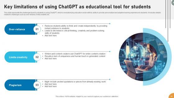 This slide represents the challenges faced by students in using ChatGPT, which is revolutionizing education sector with its ability to provide personalized and adaptive learning experience to students. It includes details related to challenges such as over-reliance, limits creativity etc. The best PPT templates are a great way to save time, energy, and resources. Slidegeeks have 100 percent editable powerpoint slides making them incredibly versatile. With these quality presentation templates, you can create a captivating and memorable presentation by combining visually appealing slides and effectively communicating your message. Download Key Limitations Of Using ChatGPT As Educational Applications Of ChatGPT In Education ChatGPT SS V from Slidegeeks and deliver a wonderful presentation. This slide represents the challenges faced by students in using ChatGPT, which is revolutionizing education sector with its ability to provide personalized and adaptive learning experience to students. It includes details related to challenges such as over-reliance, limits creativity etc.
