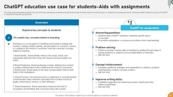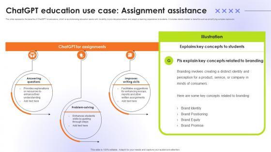 This slide represents details related to use of AI technology designed to understand and generate human-like texts based on received inputs, by students for educational purpose. It includes details related to use case of ChatGPT by students for help with assignments. There are so many reasons you need a ChatGPT Education Use Case For Students Aids Applications Of ChatGPT In Education ChatGPT SS V. The first reason is you can not spend time making everything from scratch, Thus, Slidegeeks has made presentation templates for you too. You can easily download these templates from our website easily. This slide represents details related to use of AI technology designed to understand and generate human-like texts based on received inputs, by students for educational purpose. It includes details related to use case of ChatGPT by students for help with assignments.