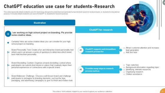 This slide represents details related to use of AI technology designed to understand and generate human-like texts based on received inputs, by students for educational purpose. It includes details related to use case of ChatGPT by students for research purpose. Get a simple yet stunning designed ChatGPT Education Use Case For Students Research Applications Of ChatGPT In Education ChatGPT SS V. It is the best one to establish the tone in your meetings. It is an excellent way to make your presentations highly effective. So, download this PPT today from Slidegeeks and see the positive impacts. Our easy-to-edit ChatGPT Education Use Case For Students Research Applications Of ChatGPT In Education ChatGPT SS V can be your go-to option for all upcoming conferences and meetings. So, what are you waiting for Grab this template today. This slide represents details related to use of AI technology designed to understand and generate human-like texts based on received inputs, by students for educational purpose. It includes details related to use case of ChatGPT by students for research purpose.