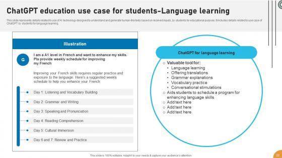 This slide represents details related to use of AI technology designed to understand and generate human-like texts based on received inputs, by students for educational purpose. It includes details related to use case of ChatGPT by students for language learning. Do you have to make sure that everyone on your team knows about any specific topic I yes, then you should give ChatGPT Education Use Case For Students Applications Of ChatGPT In Education ChatGPT SS V a try. Our experts have put a lot of knowledge and effort into creating this impeccable ChatGPT Education Use Case For Students Applications Of ChatGPT In Education ChatGPT SS V. You can use this template for your upcoming presentations, as the slides are perfect to represent even the tiniest detail. You can download these templates from the Slidegeeks website and these are easy to edit. So grab these today This slide represents details related to use of AI technology designed to understand and generate human-like texts based on received inputs, by students for educational purpose. It includes details related to use case of ChatGPT by students for language learning.