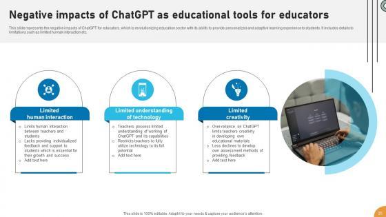 This slide represents the negative impacts of ChatGPT for educators, which is revolutionizing education sector with its ability to provide personalized and adaptive learning experience to students. It includes details to limitations such as limited human interaction etc. The Negative Impacts Of ChatGPT As Educational Applications Of ChatGPT In Education ChatGPT SS V is a compilation of the most recent design trends as a series of slides. It is suitable for any subject or industry presentation, containing attractive visuals and photo spots for businesses to clearly express their messages. This template contains a variety of slides for the user to input data, such as structures to contrast two elements, bullet points, and slides for written information. Slidegeeks is prepared to create an impression. This slide represents the negative impacts of ChatGPT for educators, which is revolutionizing education sector with its ability to provide personalized and adaptive learning experience to students. It includes details to limitations such as limited human interaction etc.