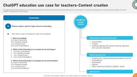 This slide represents details related to use of AI technology designed to understand and generate human-like texts based on received inputs, by educators for teaching purpose. It includes details related to use case of ChatGPT by educators for content creation. From laying roadmaps to briefing everything in detail, our templates are perfect for you. You can set the stage with your presentation slides. All you have to do is download these easy-to-edit and customizable templates. ChatGPT Education Use Case For Teachers Applications Of ChatGPT In Education ChatGPT SS V will help you deliver an outstanding performance that everyone would remember and praise you for. Do download this presentation today. This slide represents details related to use of AI technology designed to understand and generate human-like texts based on received inputs, by educators for teaching purpose. It includes details related to use case of ChatGPT by educators for content creation.