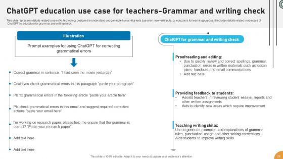 This slide represents details related to use of AI technology designed to understand and generate human-like texts based on received inputs, by educators for teaching purpose. It includes details related to use case of ChatGPT by educators for grammar and writing check. Do you have an important presentation coming up Are you looking for something that will make your presentation stand out from the rest Look no further than ChatGPT Education Use Case For Teachers Grammar Applications Of ChatGPT In Education ChatGPT SS V. With our professional designs, you can trust that your presentation will pop and make delivering it a smooth process. And with Slidegeeks, you can trust that your presentation will be unique and memorable. So why wait Grab ChatGPT Education Use Case For Teachers Grammar Applications Of ChatGPT In Education ChatGPT SS V today and make your presentation stand out from the rest This slide represents details related to use of AI technology designed to understand and generate human-like texts based on received inputs, by educators for teaching purpose. It includes details related to use case of ChatGPT by educators for grammar and writing check.