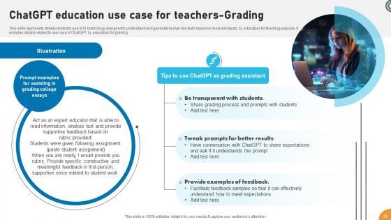 This slide represents details related to use of AI technology designed to understand and generate human-like texts based on received inputs, by educators for teaching purpose. It includes details related to use case of ChatGPT by educators for grading. Slidegeeks is here to make your presentations a breeze with ChatGPT Education Use Case For Teachers Grading Applications Of ChatGPT In Education ChatGPT SS V With our easy-to-use and customizable templates, you can focus on delivering your ideas rather than worrying about formatting. With a variety of designs to choose from, you are sure to find one that suits your needs. And with animations and unique photos, illustrations, and fonts, you can make your presentation pop. So whether you are giving a sales pitch or presenting to the board, make sure to check out Slidegeeks first This slide represents details related to use of AI technology designed to understand and generate human-like texts based on received inputs, by educators for teaching purpose. It includes details related to use case of ChatGPT by educators for grading.