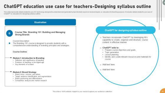 This slide represents details related to use of AI technology designed to understand and generate human-like texts based on received inputs, by educators for teaching purpose. It includes details related to use case of ChatGPT by educators for designing syllabus outline. Present like a pro with ChatGPT Education Use Case For Teachers Designing Applications Of ChatGPT In Education ChatGPT SS V. Create beautiful presentations together with your team, using our easy-to-use presentation slides. Share your ideas in real-time and make changes on the fly by downloading our templates. So whether you are in the office, on the go, or in a remote location, you can stay in sync with your team and present your ideas with confidence. With Slidegeeks presentation got a whole lot easier. Grab these presentations today. This slide represents details related to use of AI technology designed to understand and generate human-like texts based on received inputs, by educators for teaching purpose. It includes details related to use case of ChatGPT by educators for designing syllabus outline.